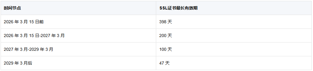 2025 年 4 月 CA/B 论坛通过一项 SSL 证书有效期缩短的提案:自 2026 年 3 月 15 日起,所有 SSL 证书最长有效期缩短至 200 天;2029 年 3 月 15 日后,进一步缩短至 47 天。具体时间计划如下: